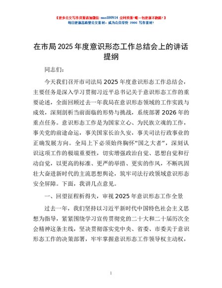 / 在市局2025年度意识形态工作总结会上的讲话提纲