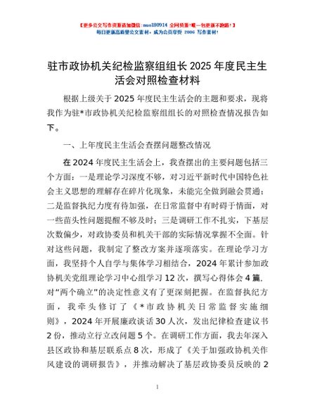/ 驻市政协机关纪检监察组组长2025年度民主生活会对照检查材料
