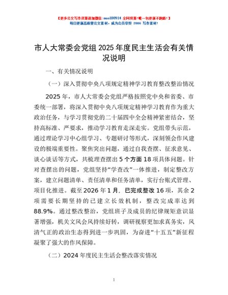 / 市人大常委会党组2025年度民主生活会有关情况说明