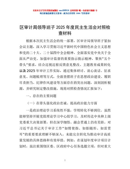 / 区审计局领导班子2025年度民主生活会对照检查材料