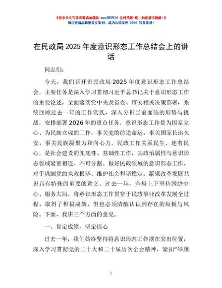 / 在民政局2025年度意识形态工作总结会上的讲话