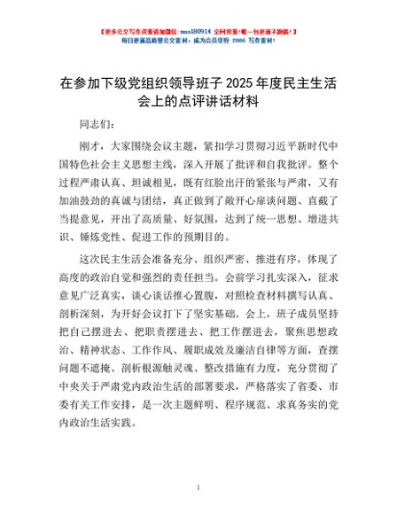 / 在参加下级党组织领导班子2025年度民主生活会上的点评讲话材料