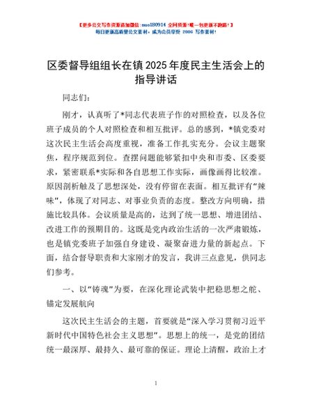 / 区委督导组组长在镇2025年度民主生活会上的指导讲话
