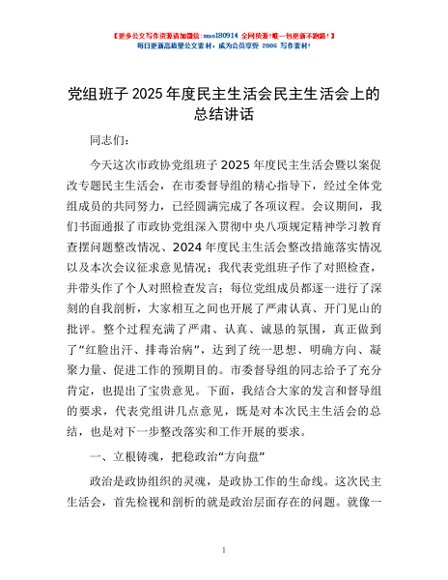 / 党组班子2025年度民主生活会民主生活会上的总结讲话