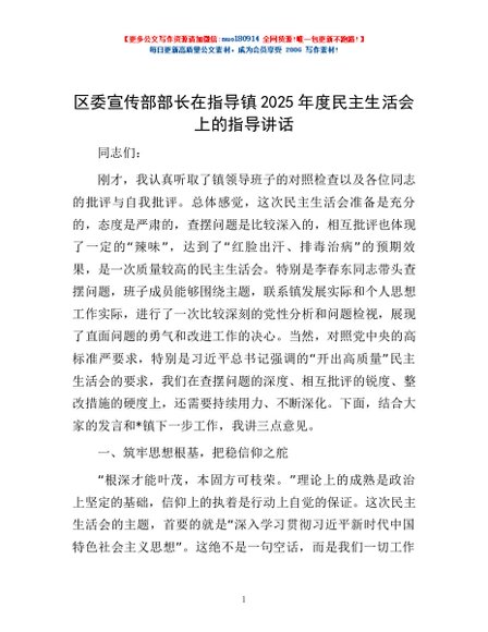 / 区委宣传部部长在指导镇2025年度民主生活会上的指导讲话