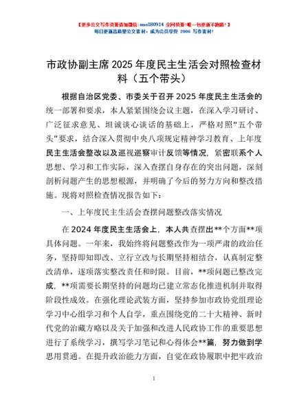 / 市政协副主席2025年度民主生活会对照检查材料(五个带头)