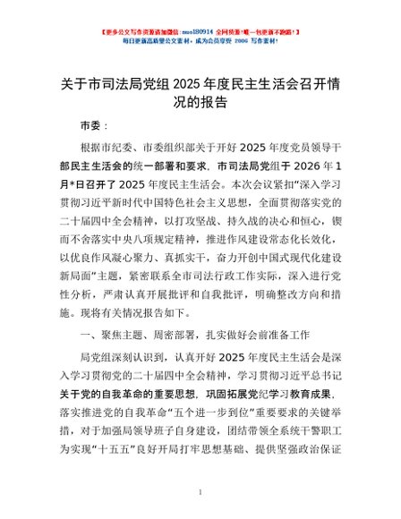 / 关于市司法局党组2025年度民主生活会召开情况的报告