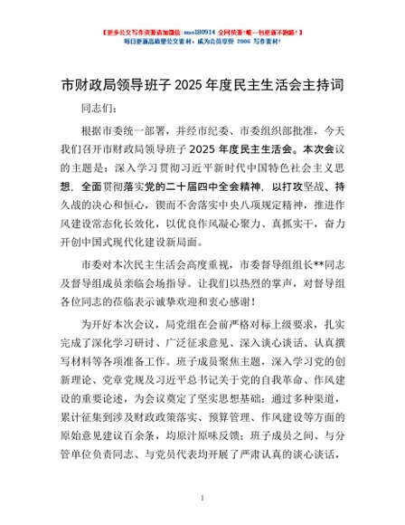 / 市财政局领导班子2025年度民主生活会主持词