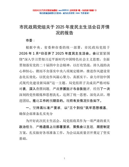 / 市民政局党组关于2025年度民主生活会召开情况的报告