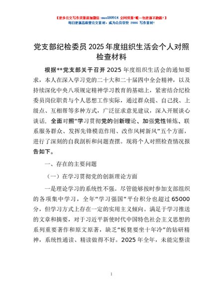 / 党支部纪检委员2025年度组织生活会个人对照检查材料