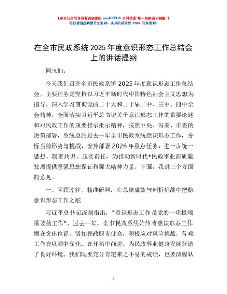 / 在全市民政系统2025年度意识形态工作总结会上的讲话提纲