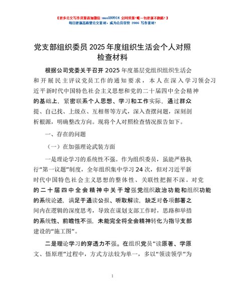/ 党支部组织委员2025年度组织生活会个人对照检查材料
