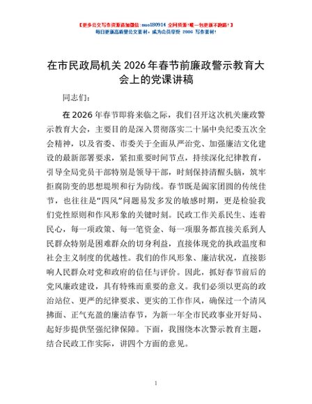 / 在市民政局机关2026年春节前廉政警示教育大会上的党课讲稿