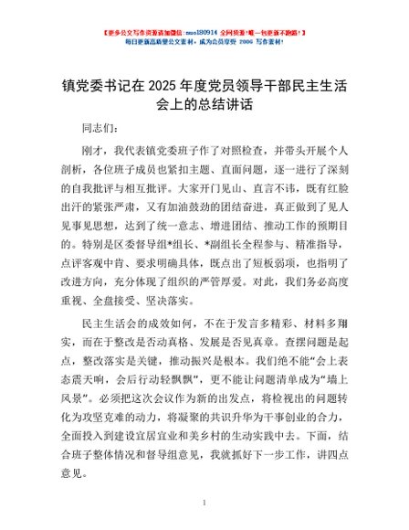 / 镇党委书记在2025年度党员领导干部民主生活会上的总结讲话