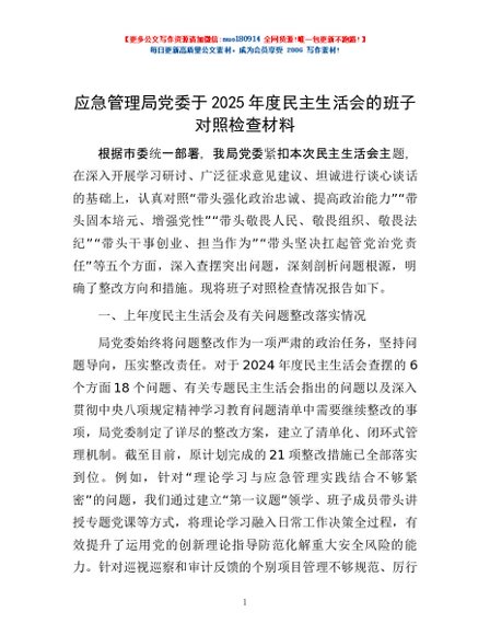 / 应急管理局党委于2025年度民主生活会的班子对照检查材料