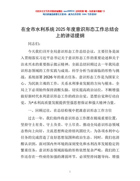 / 在全市水利系统2025年度意识形态工作总结会上的讲话提纲