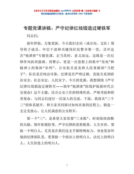 / 专题党课讲稿:严守纪律红线 锻造过硬铁军