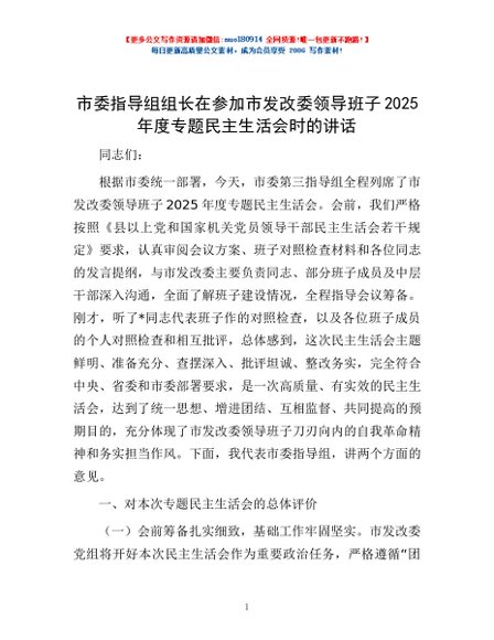 / 市委指导组组长在参加市发改委领导班子2025年度专题民主生活会时的讲话