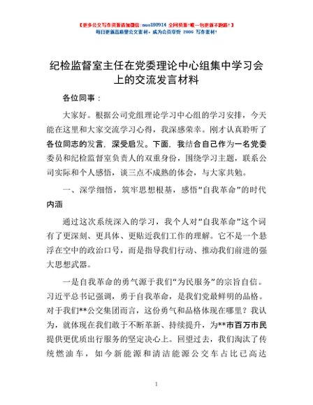 / 纪检监督室主任在党委理论中心组集中学习会上的交流发言材料