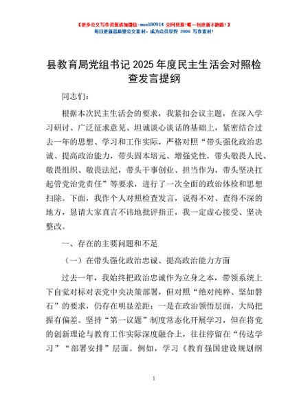 / 县教育局党组书记2025年度民主生活会对照检查发言提纲