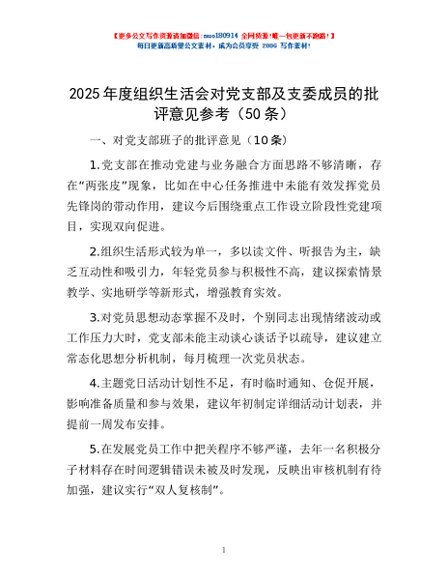 / 2025年度组织生活会对党支部及支委成员的批评意见参考(50条)