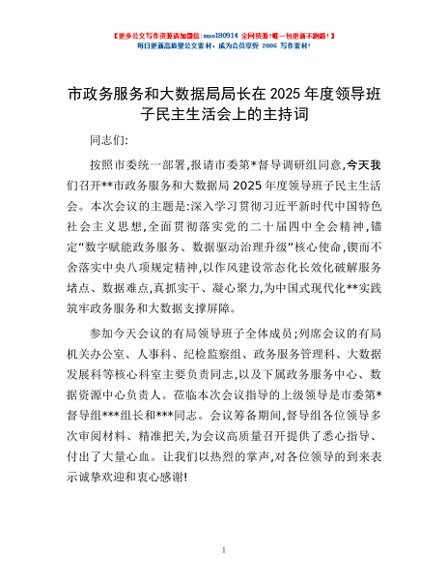 / 市政务服务和大数据局局长在2025年度领导班子民主生活会上的主持词