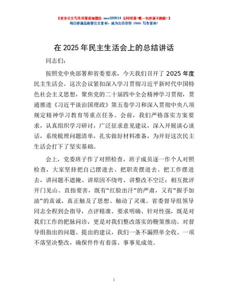 / 在2025年民主生活会上的总结讲话