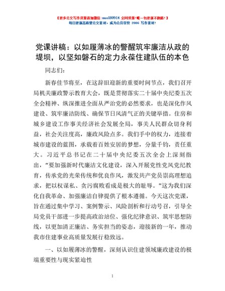 / 党课讲稿:以如履薄冰的警醒筑牢廉洁从政的堤坝,以坚如磐石的定力永葆住建队伍的本色