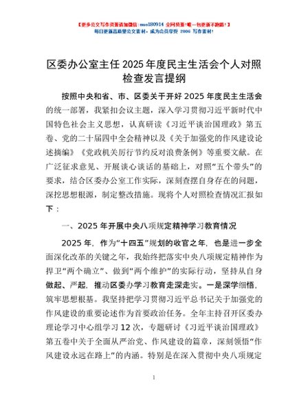 / 区委办公室主任2025年度民主生活会个人对照检查发言提纲