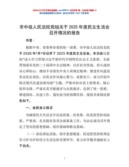 / 市中级人民法院党组关于2025年度民主生活会召开情况的报告