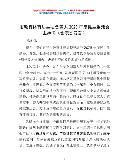/ 市教育体育局主要负责人2025年度民主生活会主持词(含表态发言)