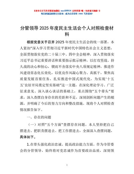 / 分管领导2025年度民主生活会个人对照检查材料