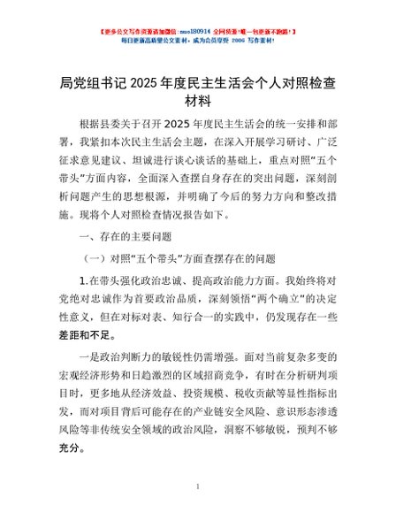 / 局党组书记2025年度民主生活会个人对照检查材料