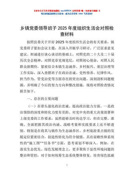 / 乡镇党委领导班子2025年度组织生活会对照检查材料
