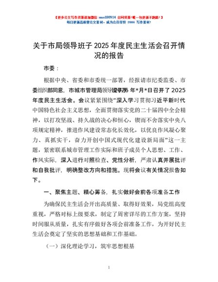 / 关于市局领导班子2025年度民主生活会召开情况的报告