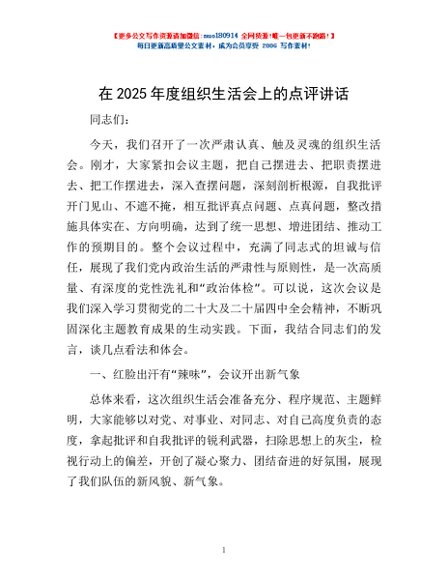 / 在2025年度组织生活会上的点评讲话