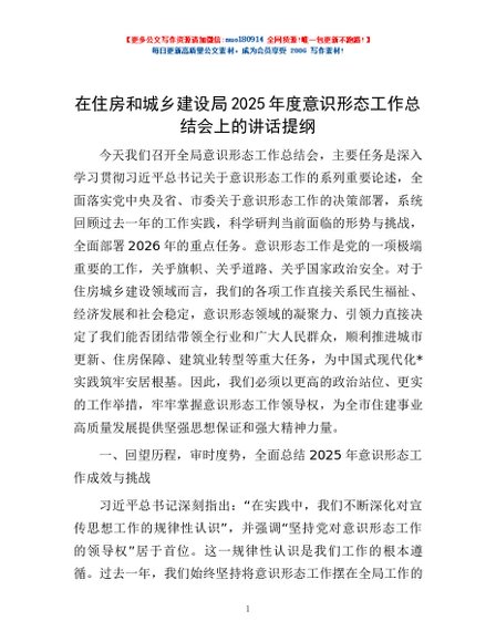 / 在住房和城乡建设局2025年度意识形态工作总结会上的讲话提纲