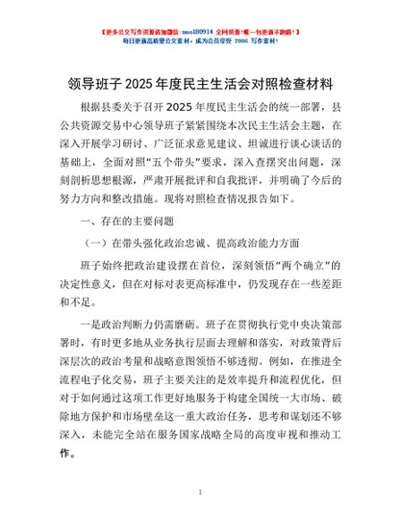 / 领导班子2025年度民主生活会对照检查材料