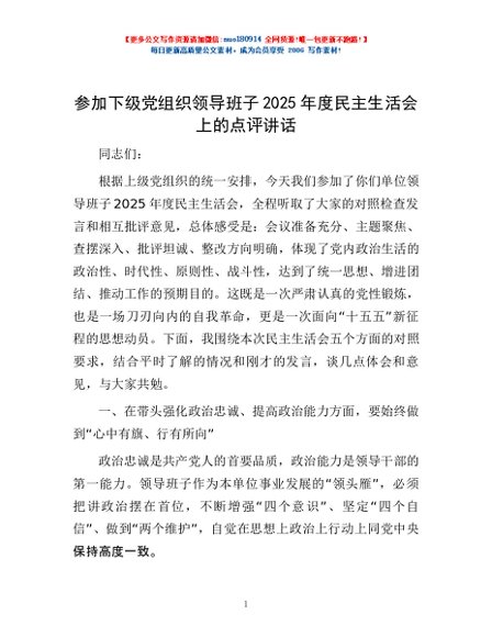 / 参加下级党组织领导班子2025年度民主生活会上的点评讲话
