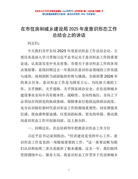 / 在市住房和城乡建设局2025年度意识形态工作总结会上的讲话