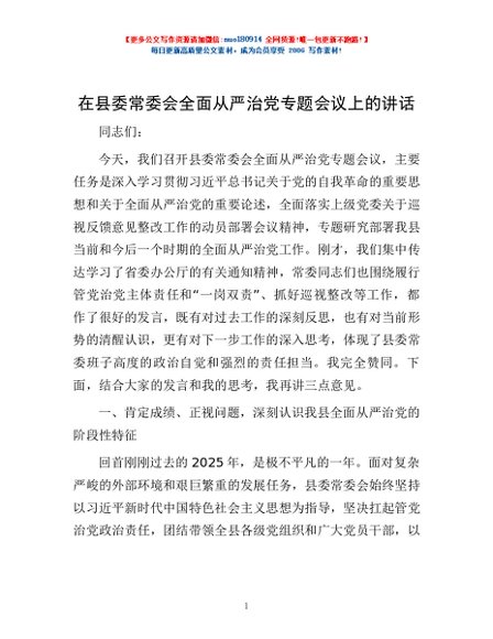 / 在县委常委会全面从严治党专题会议上的讲话