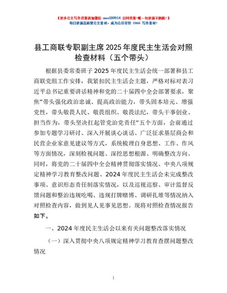 / 县工商联专职副主席2025年度民主生活会对照检查材料(五个带头)