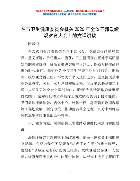 / 在市卫生健康委员会机关2026年全体干部政绩观教育大会上的党课讲稿