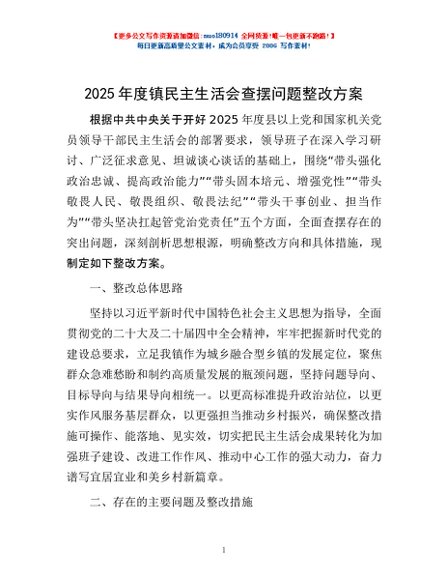 / 2025年度镇民主生活会查摆问题整改方案