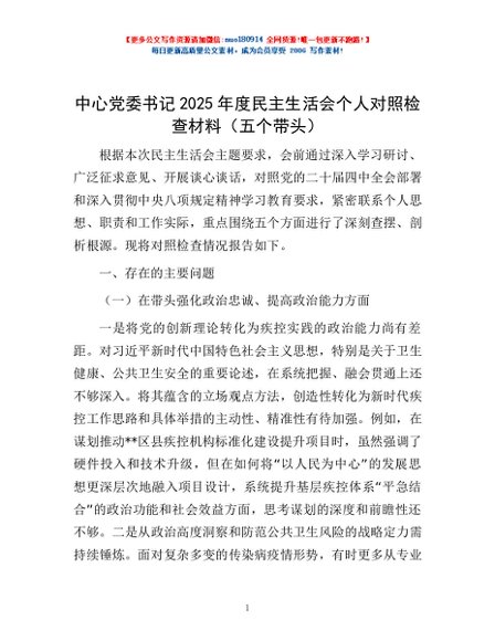 / 中心党委书记2025年度民主生活会个人对照检查材料(五个带头)