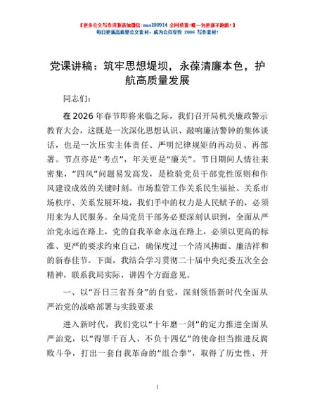 / 党课讲稿:筑牢思想堤坝,永葆清廉本色,护航高质量发展