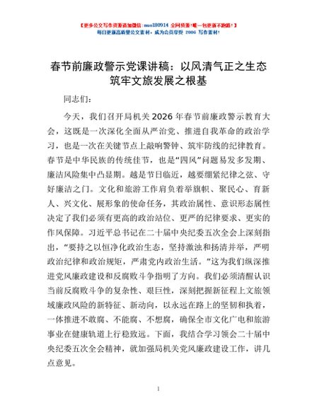 / 春节前廉政警示党课讲稿:以风清气正之生态筑牢文旅发展之根基