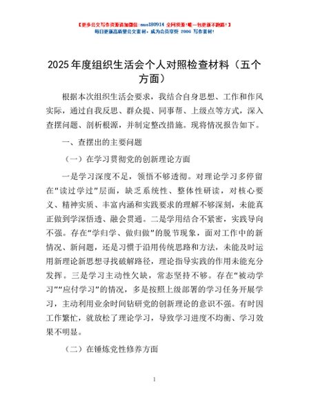 / 2025年度组织生活会个人对照检查材料(五个方面)
