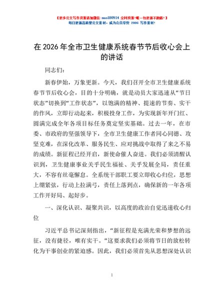 / 在2026年全市卫生健康系统春节节后收心会上的讲话