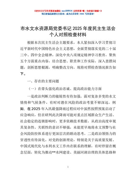 / 市水文水资源局党委书记2025年度民主生活会个人对照检查材料